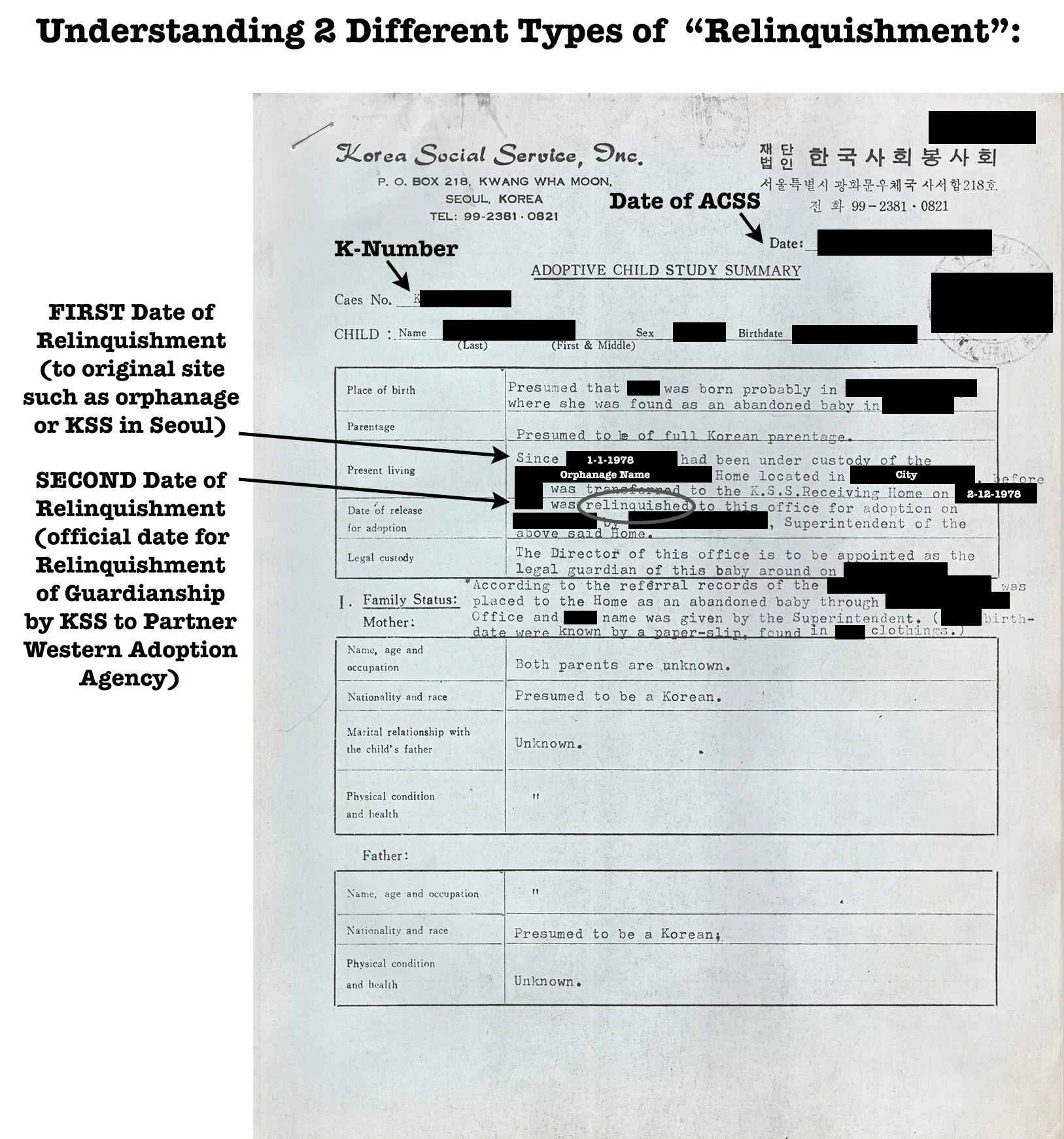 We refer to “Relinquishment” as the first date that you were physically in KSS’ system - whether you were Relinquished to the “K.S.S. Receiving Home in Seoul” (which was basically KSS’ campus in Seoul), a “Feeder Orphanage”, maternity clinic, hospital, single unwed mothers’ home, etc. Basically, what we call “Relinquishment” is the first day that you were no longer with your birth family, and were within KSS’ system.