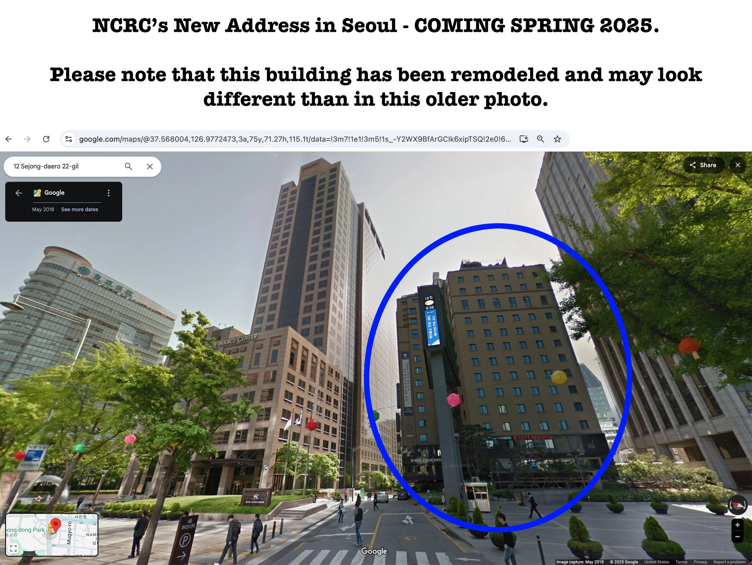 Address: 4th-10th floors, 12, Sejong-daero 22-gil, Jung-gu, Seoul, Republic of Korea (Real Korean Translator Translation of New NCRC Address from NCRC Press Release)