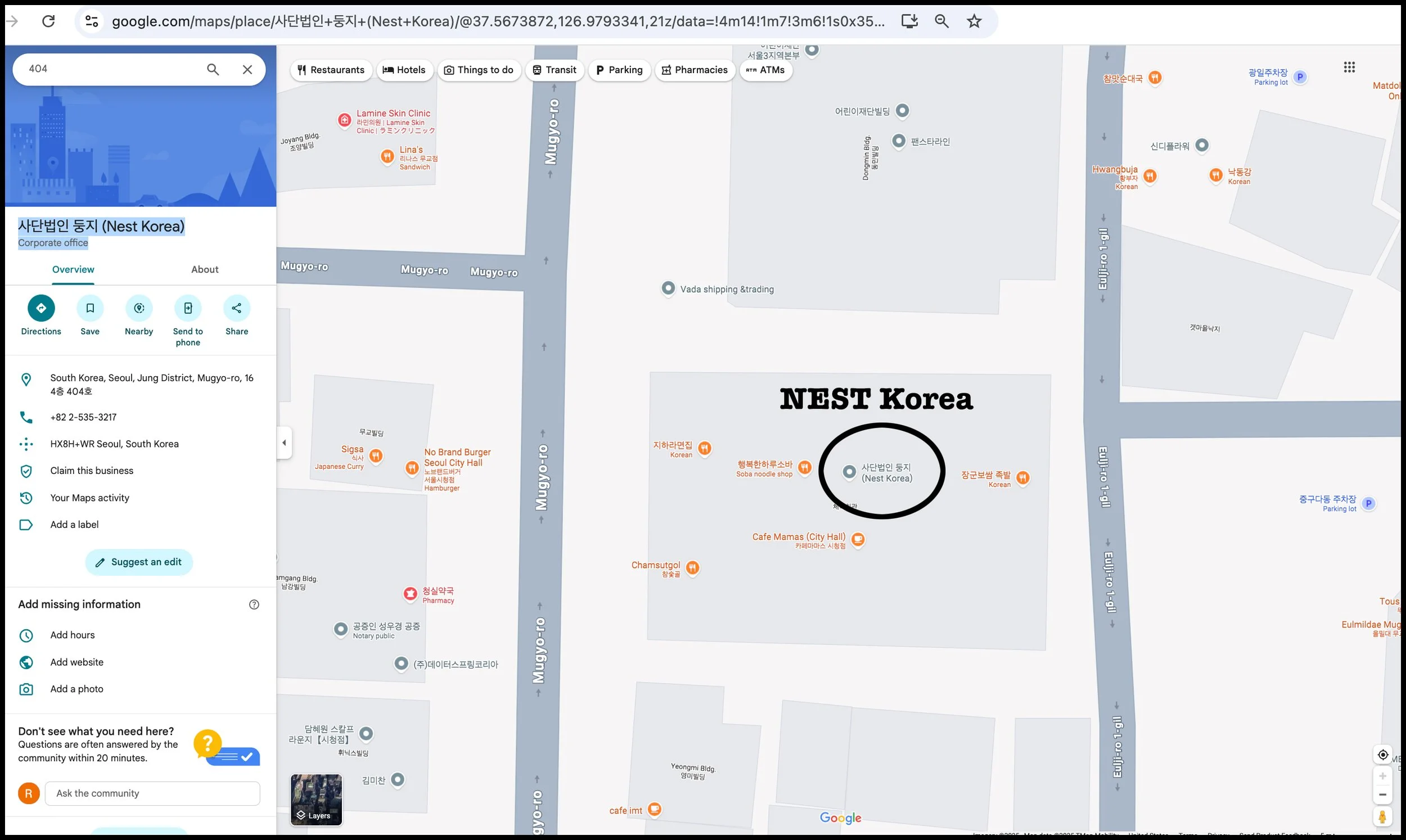 Address #404, 16 Mugyo-ro, Jung-gu, Seoul, Korea