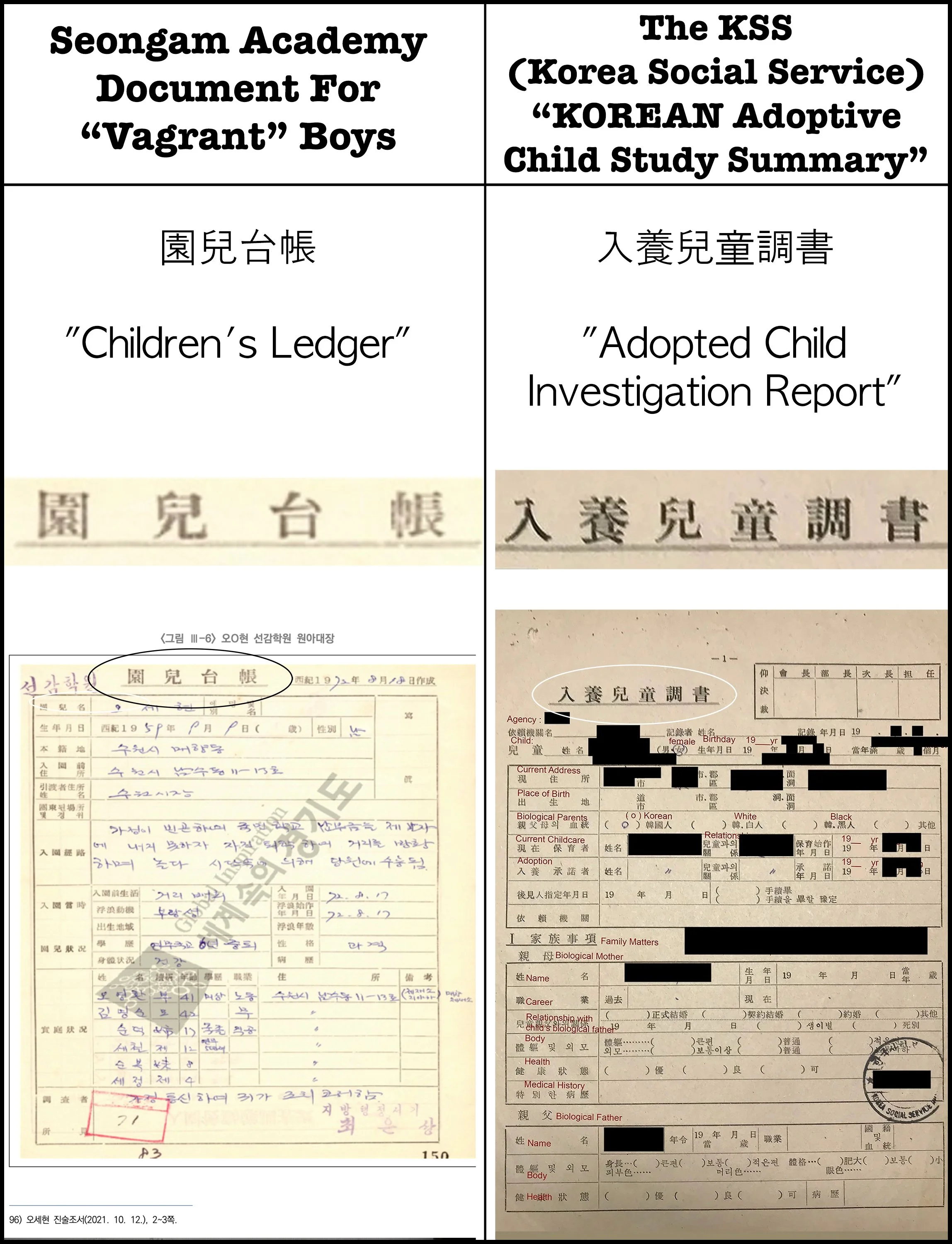 Side By Side Images of A Seongam Academy “Vagrant” Inmate Document And The KSS (Korea Social Service) “Korean Adoptive Child Study Summary”.