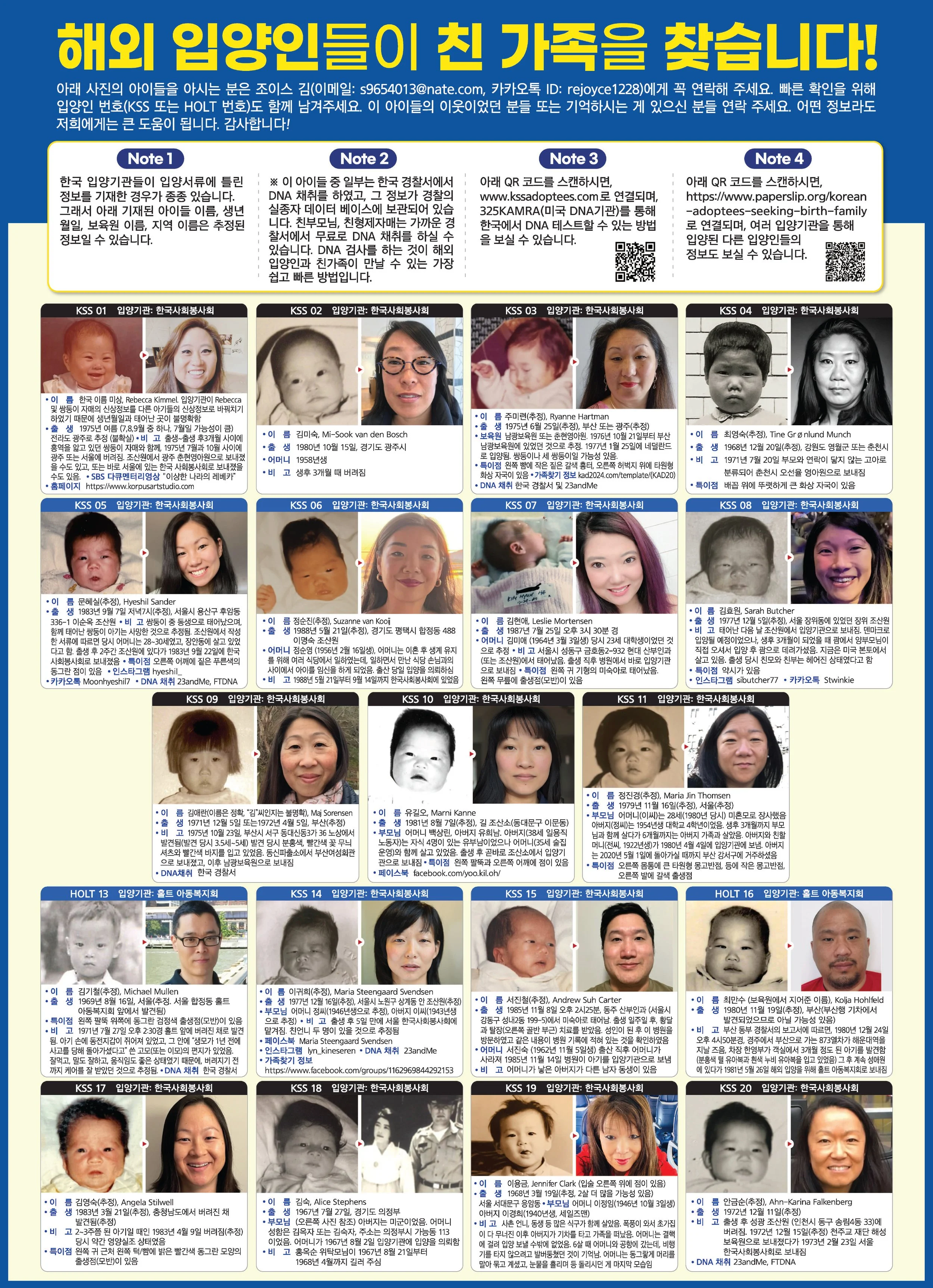 아래 사진의 아이들을 아시는 분은 조이스 김(이메일: s9654013@nate.com / 카카오톡 ID: rejoyce1228)에게 꼭 연락해 주세요. 빠른 확인을 위해 입양인 번호(KSS 또는 HOLT 번호)도 함께 남겨주세요. 이 아이들의 이웃이었던 분들 또는 기억하시는 게 있으신 분들 연락 주세요. 어떤 정보라도 저희에게는 큰 도움이 됩니다. 감사합니다!