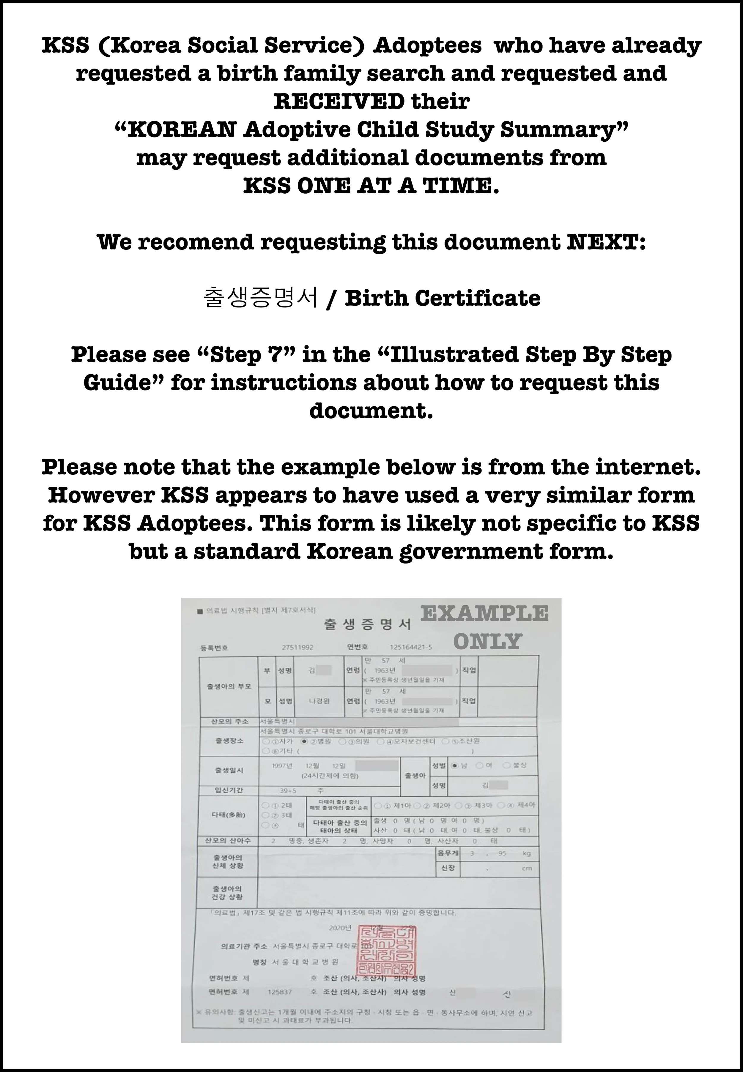 KSS Adoptees Should Request Their: 출생증명서 / Birth Certificate.