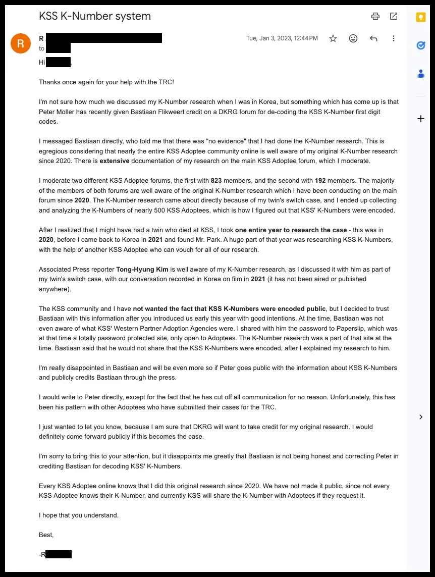 I messaged Bastiaan directly, who told me that there was "no evidence" that I had done the K-Number research. This is egregious considering that nearly the entire KSS Adoptee community online is well aware of my original K-Number research since 2020. There is extensive documentation of my research on the main KSS Adoptee forum, which I moderate.