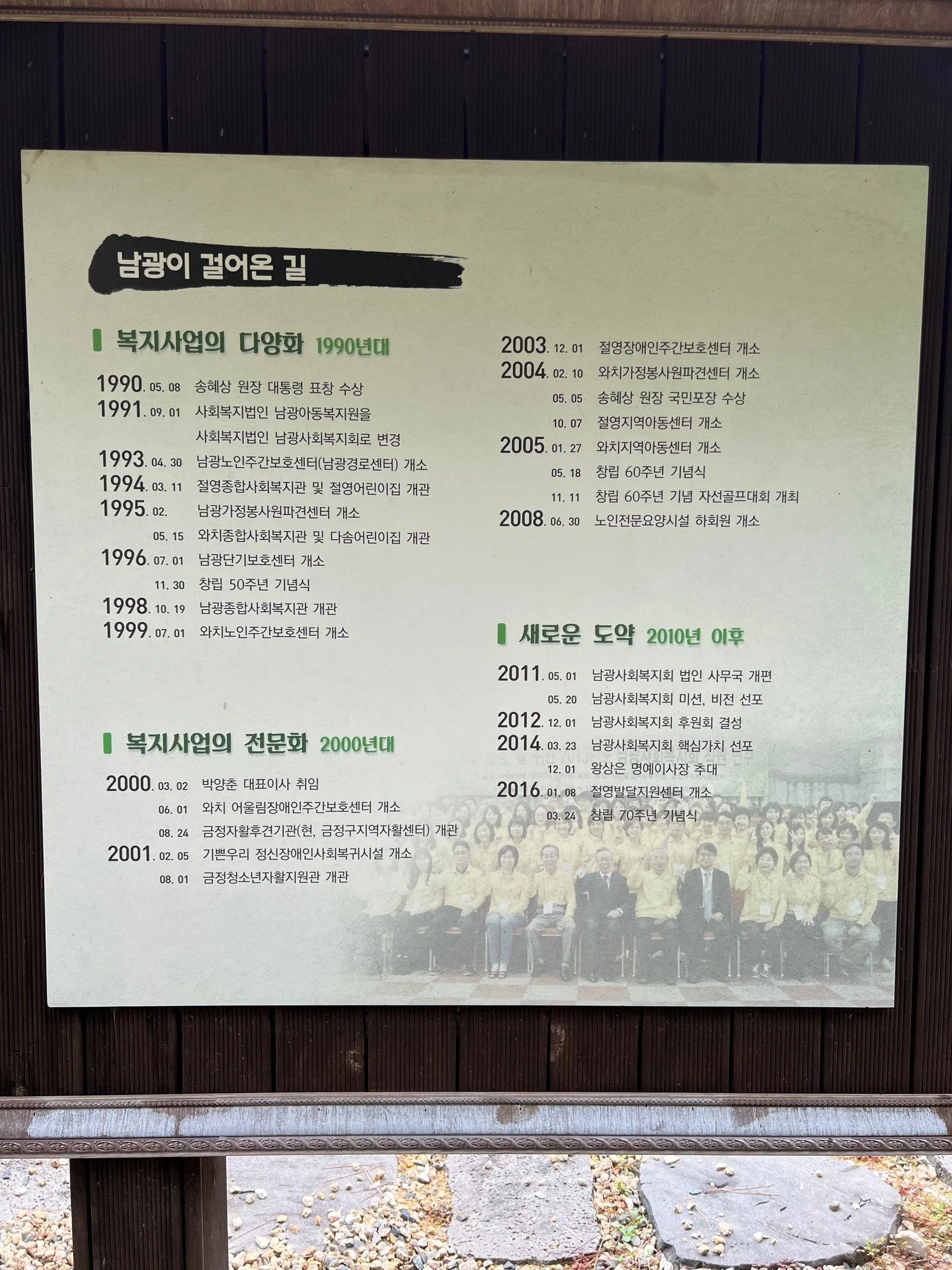 The name of the mountain behind the Namgwang Social Welfare Association is Gukshil Mountain. "Gukshil" (meaning "national fruit" or "national treasure") signifies the bounty of the nation. In front of Gukshil Mountain flows the Suyeong Stream, and the spirit of Gukshil Mountain envelops the Namgwang Social Welfare Association. Established initially on the foundation of child welfare projects, Namgwang Social Welfare Association has since expanded into various social welfare services. Just as many children connected with Namgwang have grown to become the nation’s treasures, the association continues to strive to be a beacon of hope for a brighter world, from the past through the present and into the future.