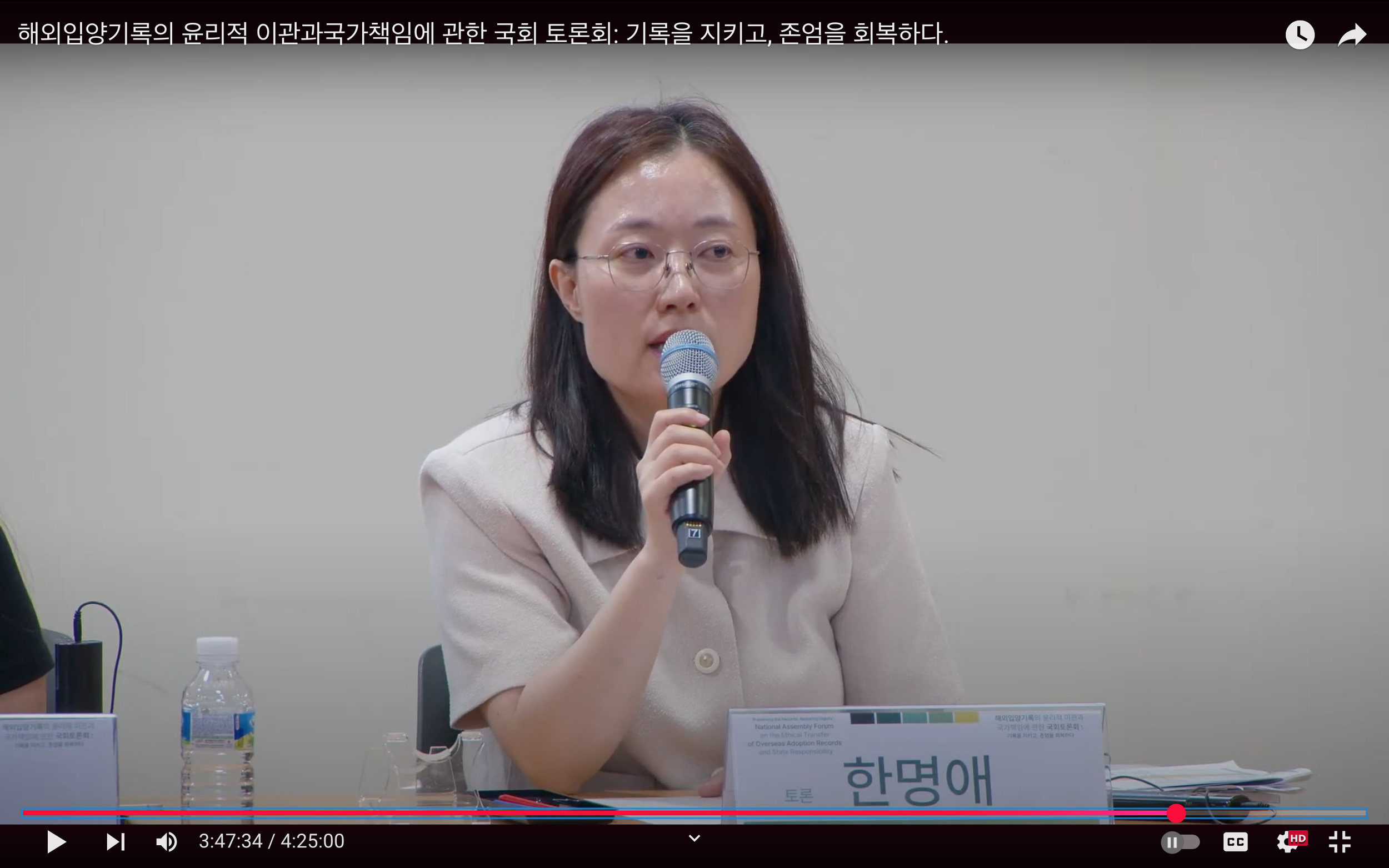 At the July 7, 2025, “National Assembly Forum on the Ethical Transfer of Overseas Adoption Records and State Responsibility: Protecting the Records, Restoring Dignity,” hosted by the group EARS, MBC Producer Namhee Lim—known for her work on the PD Note documentary exposing the failures of NCRC—raised several critical questions and comments to an NCRC representative on the conference’s panel of speakers. Unfortunately, the representative failed to address her concerns. Please see the video linked above to view the entire conference, which was livestreamed and recorded on YouTube.