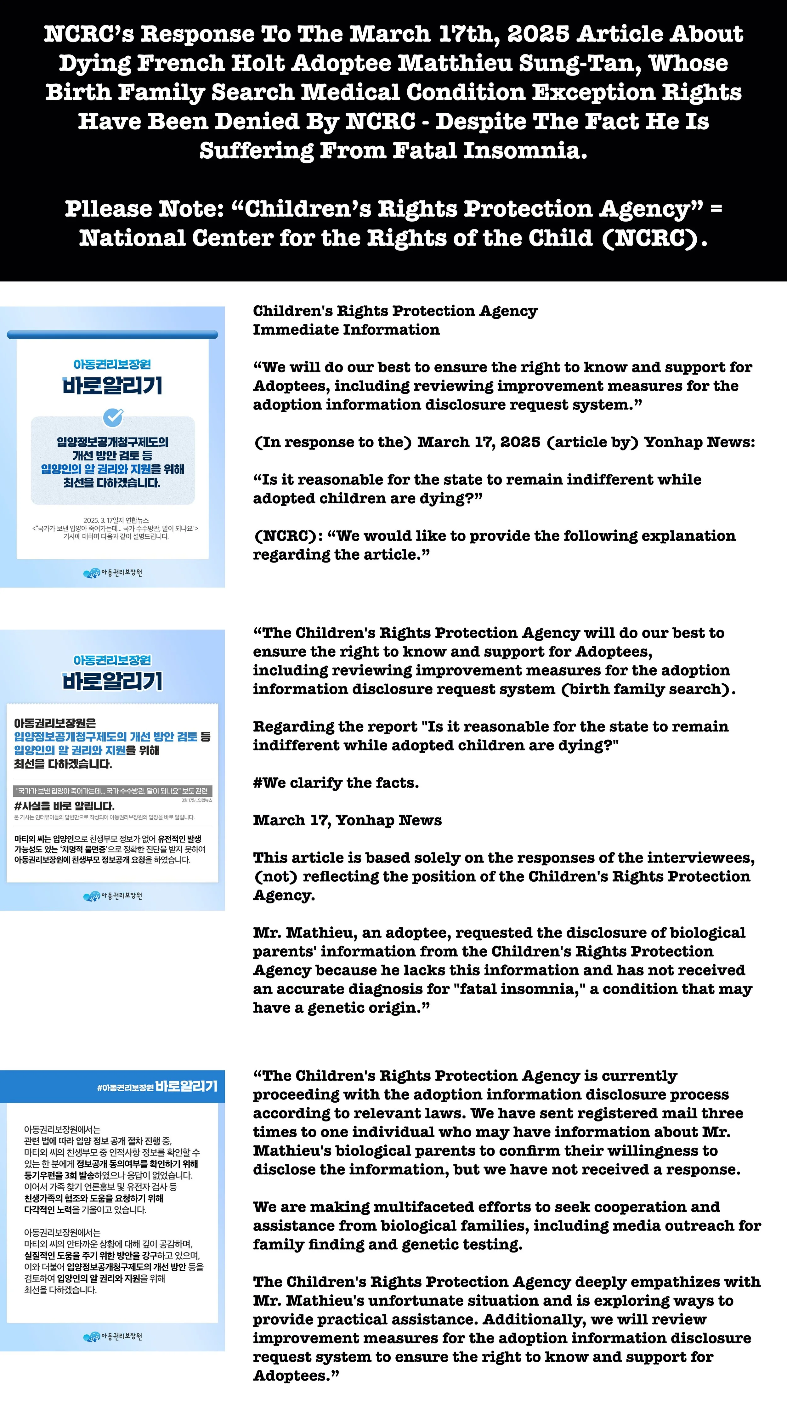 NCRC Issues Response To The “Yonhap News” Article About Dying French Holt Adoptee Matthieu Sung-Tan On It’s Public Korean Facebook Page.