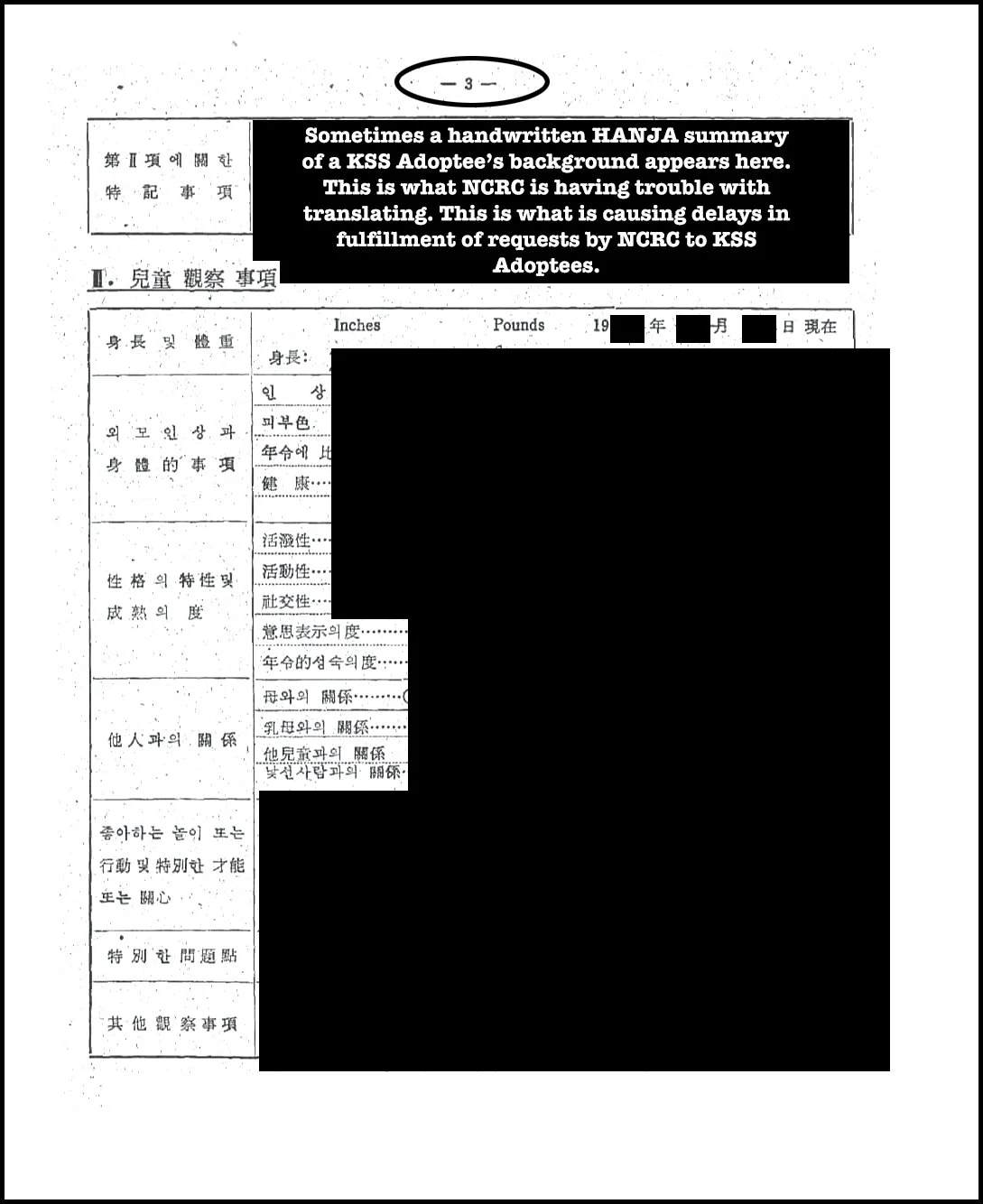NCRC may delay fulfilling requests from KSS Adoptees when NCRC possesses a formerly secret Korean Adoptive Child Study Summary (a document unique to KSS Adoptees), IF it includes a handwritten background narrative in Hanja, which NCRC staff may be unable to read. Due to strict birth parent privacy law, NCRC will want to redact any sensitive information about birth parents contained in the handwritten Hanja summary, causing a delay in sending a KSS Adoptee their KSS documents containing Hanja — since so few modern Koreans read / speak this older form of Korean, which is a blend of Korean and Chinese. NCRC already faces a substantial backlog of requests from Adoptees worldwide and has limited staff. The added burden of translating handwritten Hanja notes in the Korean Adoptive Child Study Summary documents of KSS Adoptees appears to be causing further delays — or, in some cases, preventing any disclosure of documents at all.