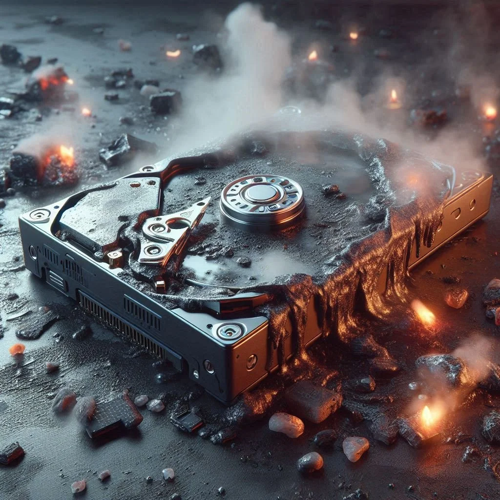 Above — our AI representation of a digital drive lost to a fire. Please note that this does not directly represent the type of drives lost in the NIRS fire and is just a generic graphical image to depict data loss.