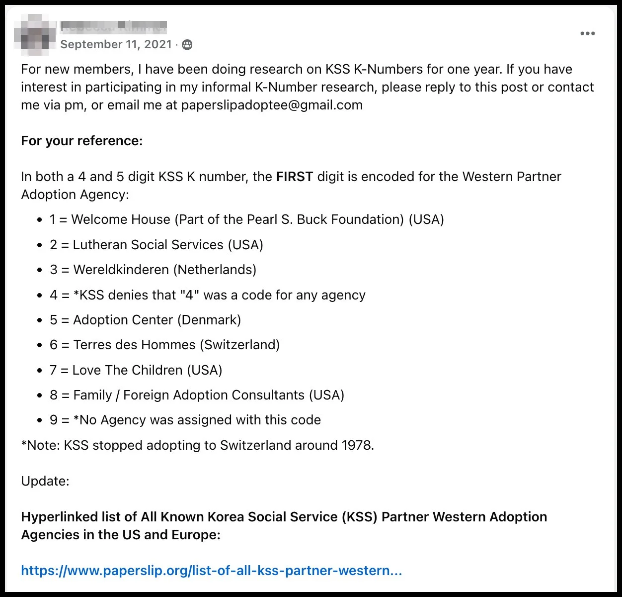 By 2021, I had successfully decoded ALL of KSS’ first-digit K-Number codes, which stood for each of KSS’ Partner Western Adoption Agencies. No one had ever done this kind of research before.