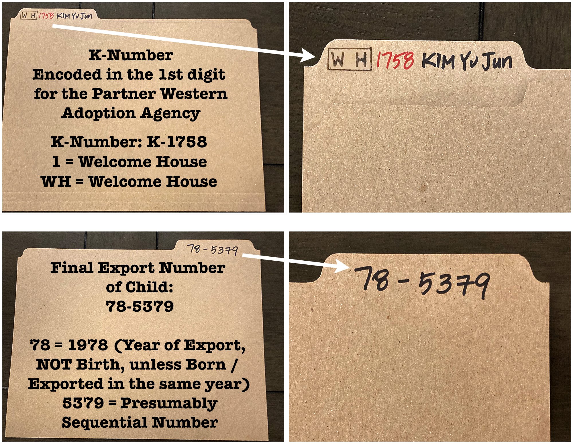 Once a child in KSS’ system was flown / sent from Korea to the West for adoption, a final “Exit Folder” number was added to the outside tab of the KSS child’s file folder at KSS, on the backside of the tab.