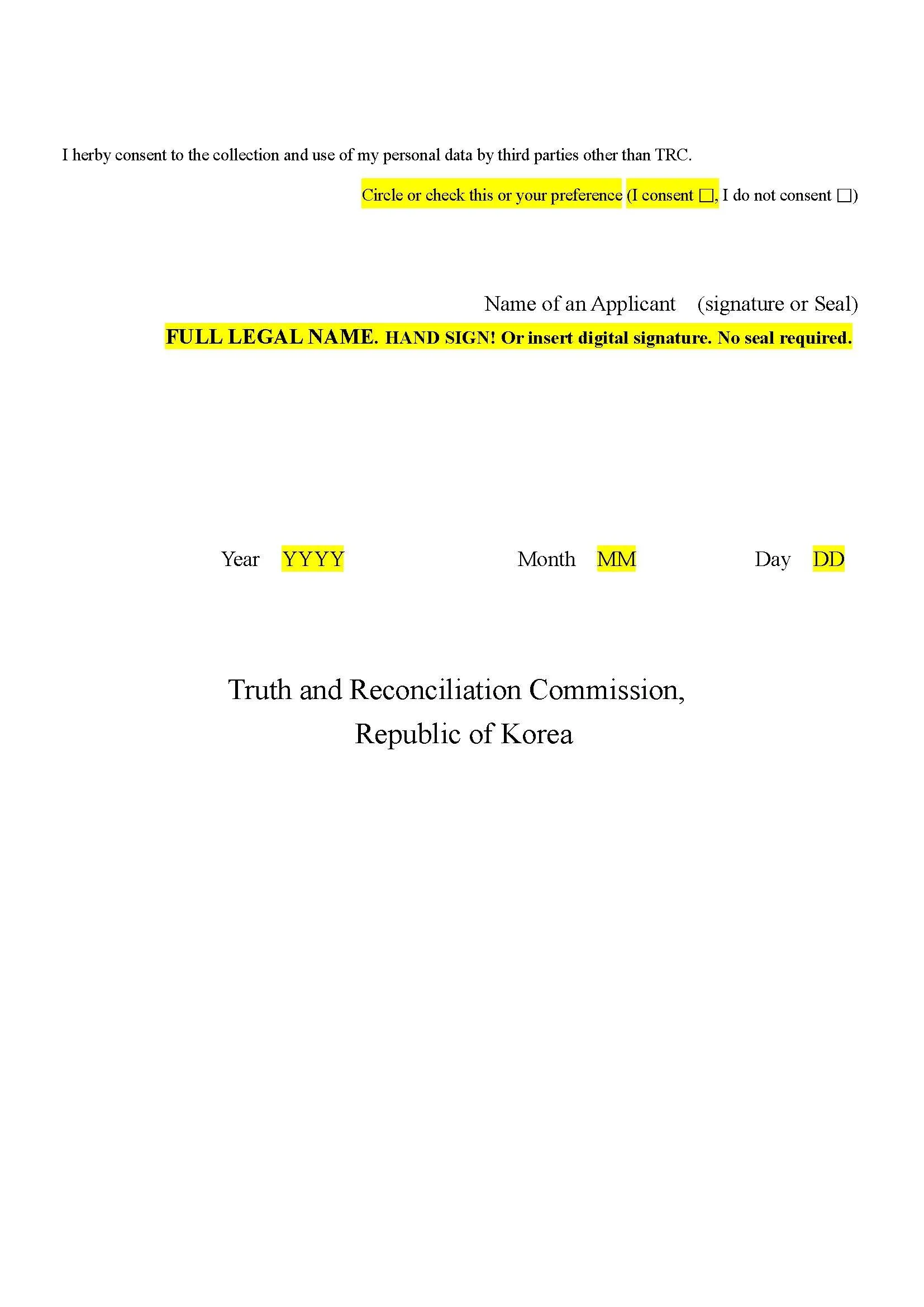 Do NOT simply submit your completed application form to a Korean Consulate or through email to TRC 3 UNTIL you understand the ENTIRE PROCESS, which we have outlined on the page linked above! If you do NOT understand the entire process, your application to TRC 3 will almost certainly FAIL — and you could harm the chance of others’ cases being investigated!