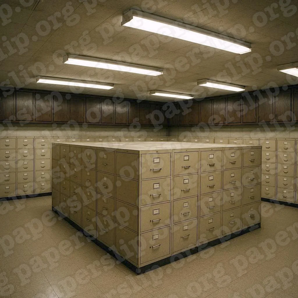 On April 12th, 2026, I attempted to generate an AI representation of KSS’ former file room. Please note that per the actual photo of KSS’ file room above, the filing cabinets were FIVE drawers high, not four. Also, the cabinets attached to the walls above the filing cabinets may have been light colored instead of dark brown. There were more rows of filing cabinets in the center of the room than the image above shows. But this gives a general feel for the very small file room at KSS. It had a very claustrophobic feeling. I was allowed into KSS’ filing room in 2019 and 2021.