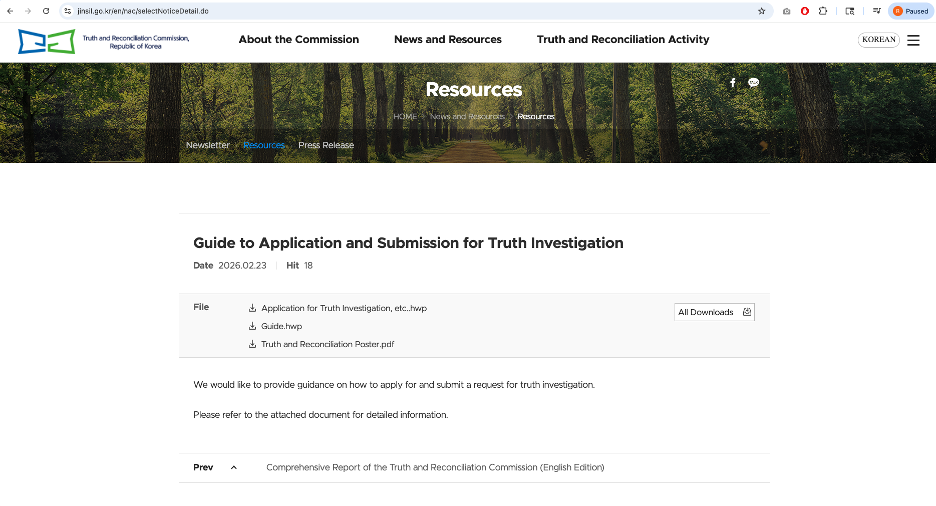 For your convenience, we have already converted the two HWP documents from the TRC 3 link above to PDF format below. Please note that we did this conversion on February 23rd, 2026, and take NO RESPONSIBILITY if the documents were converted in error, or if TRC 3 updates its forms without notice. If you are more comfortable doing so, please feel free to convert the two original HWP forms YOURSELF to PDF format! Please note that there is also a PDF document to download from the TRC 3 website. We have included ALL 3 documents in PDF format below as a BACKUP. Use these documents at your own discretion — please refer to the TRC 3 website as your essential and original guide. However, please be sure to also read the IMPORTANT information we have provided below BEFORE you submit your case to TRC 3!