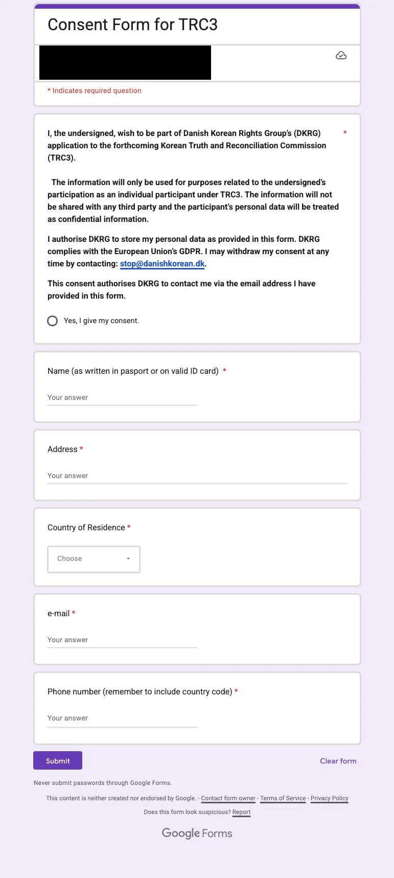 Here's the consent form that the *USKRG group makes you sign in order to even join an information session. USKRG is fully aware that Peter Moller of DKRG — who requires a signed Power of Attorney to file a TRC 3 case with DKRG — has a history of fraud in Denmark, and is NOT a licensed attorney, despite public claims to the contrary that he has made in international media since 2022.
