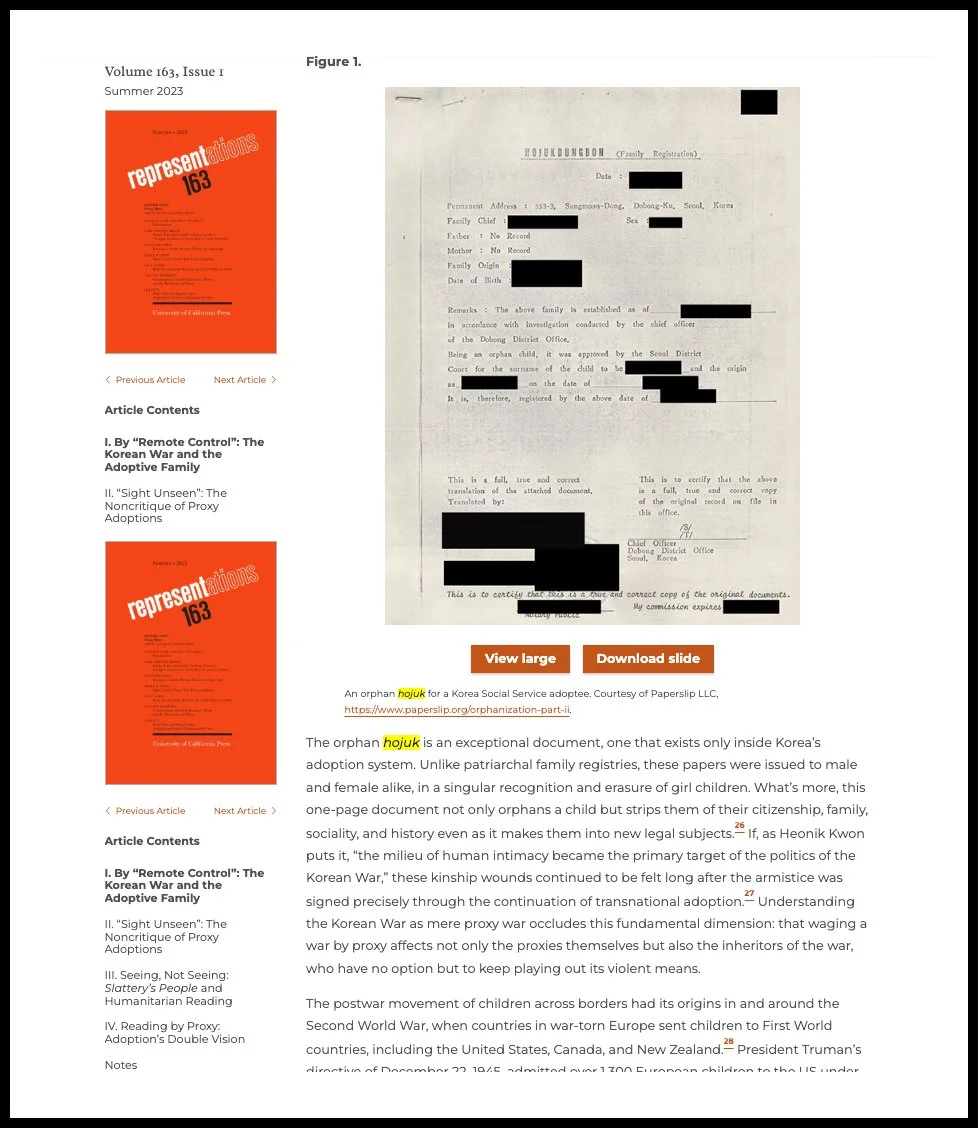 We want to belatedly publicly thank former Harvard professor turned Wellesley professor Ms. Kelly M. Rich for citing Paperslip in her excellent article, titled “Sight Unseen: Proxy War, Proxy Adoption”. Upon her request, we provided her with a copy of an Orphan Hojuk (Hojukdungbon) — a document which is a prime example and site of Orphanization — not only for KSS Adoptees, but for Korean Adoptees in general. *(Please note that not ALL Korean Adoptees were orphanized for the process of adoption to the West. However, a great deal of us were).