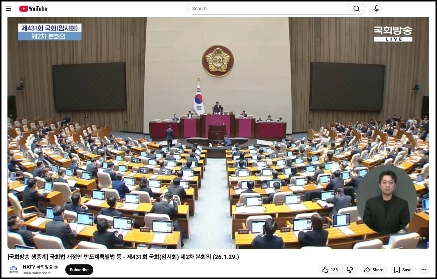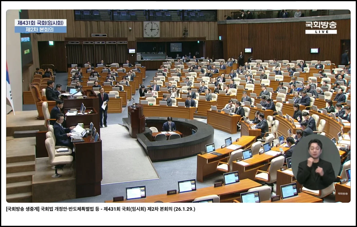 "[National Assembly Broadcasting Live] Amendment to the National Assembly Act, Special Semiconductor Act, etc. – 431st National Assembly (Extraordinary Session) 2nd Plenary Meeting (Jan. 29, 2026)"