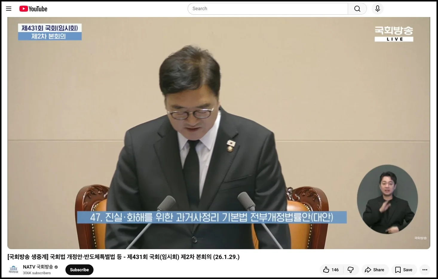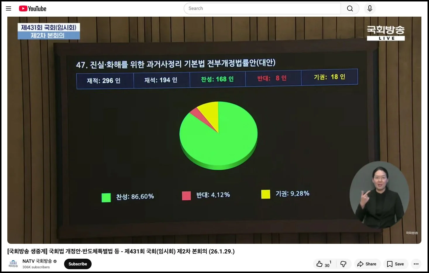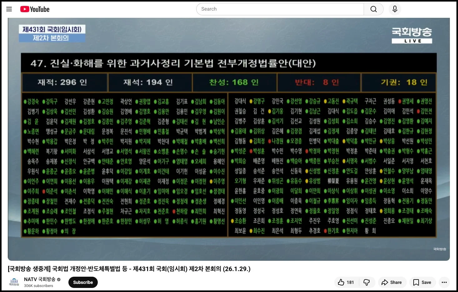 The TRC 3 bill passed in the National Assembly in S. Korea with 168 votes at the U.S. equivalent time of about 10:30 pm PST / 1:30 pm EST on Wednesday, January 28th, 2026 in the US (which is Thursday, January 29th, 2026 in S. Korea).